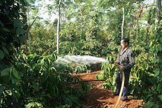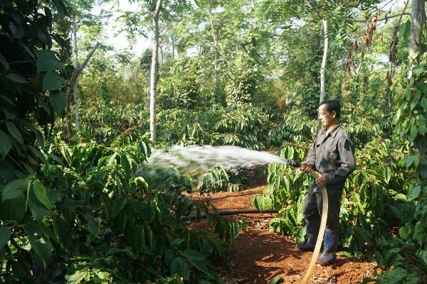 Một người dân ở Đak Lak đang tưới cho vườn cà phê. Ảnh chụp vào tháng 8-2015, lúc Tây Nguyên đã vào mùa mưa. Ảnh: TL